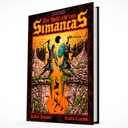 La batalla de Simancas fue escrito por Rafael Jiménez, dibujado por Raúlo Cáceres y editado por Cascaborra Ediciones en febrero de 2024. En junio de 2025 es publicado en Alemania por Dantes Verlag con el título Die Schlacht von Simancas, contando con dos ediciones: una regular y una especial limitada, con portada variante. El cómic histórico, riguroso y documentado, se da aquí la mano con la estética más pulp y épica de la fantasía heroica, usando un blanco y negro potente y unas composiciones de página barrocas que nos sumergen una atmósfera medieval y bélica. Una gozada para los amantes de la historia de España en viñetas.